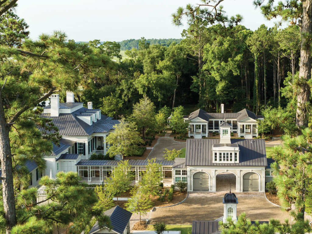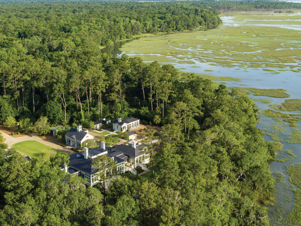 The estate is located near the tidal marshes of the Harbor River and the historic ruins of the Old Edwards Plantation. The property features a main house, carriage house, guest cottages, and a pool pavilion garden, all arranged in a historically influenced compound layout. The architecture evokes an elegant yet understated feeling, perfectly at home on the tidal marshes.