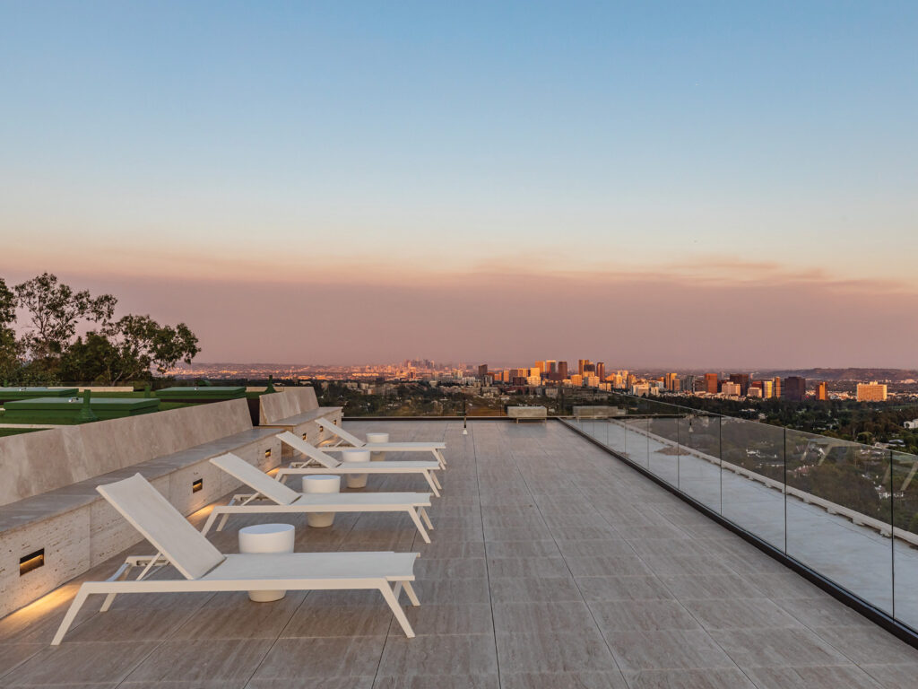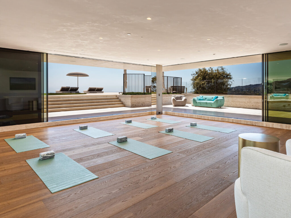 Spanning approximately 14,779 SF, the residence boasts six bedrooms and nine and a half bathrooms. The interiors are adorned with custom furnishings and luxurious materials, including suede and leather wall panels, which elevate the living spaces to unparalleled levels of sophistication. The estate is equipped with top-tier amenities, such as a home theater, fitness studio, massage room, and wine cellar, all designed to deliver the pinnacle of luxury living. Expansive glass walls frame sweeping panoramic views and seamlessly connect the indoor and outdoor spaces. Outside, the property features a spacious patio, a flat grassy lawn, an infinity pool, a spa, a built-in barbecue, and an expansive rooftop deck, all meticulously designed to enhance the quintessential coastal lifestyle. The exterior is clad in Alabastrino Travertine, creating a harmonious link between the estate and a nearby iconic art museum.