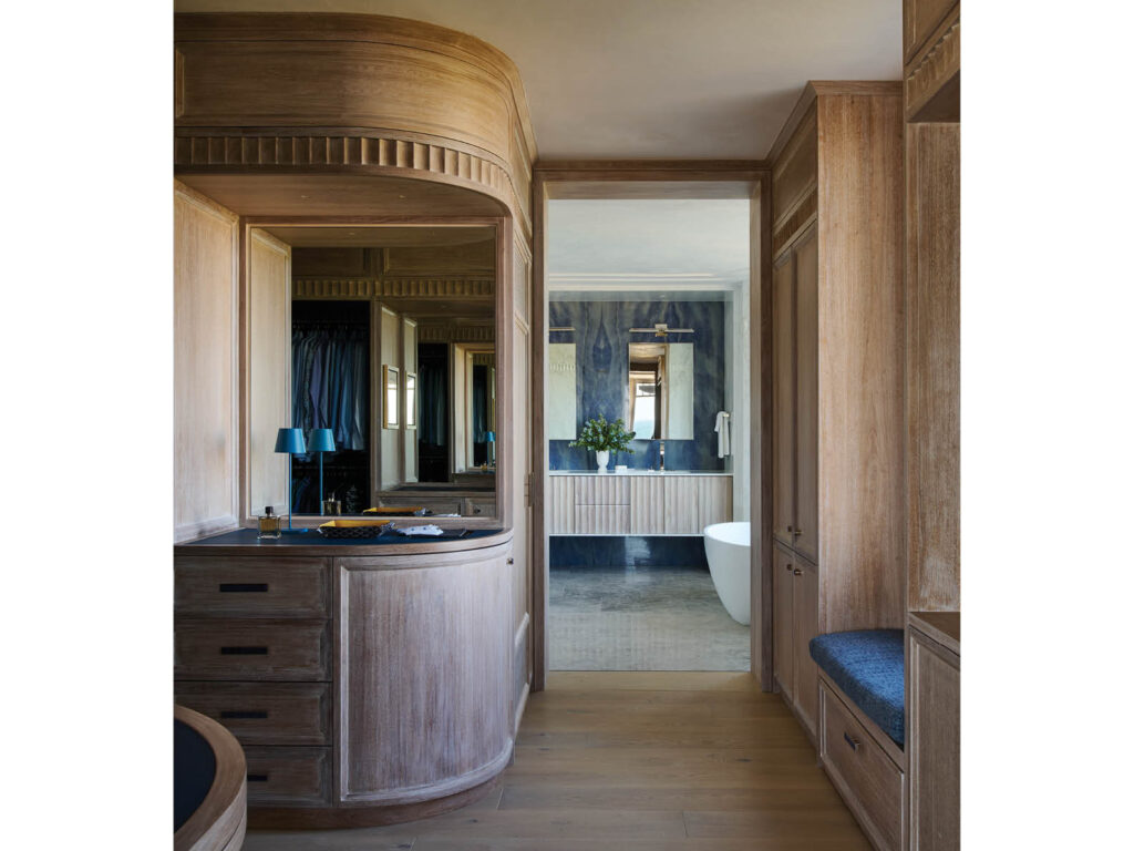 The project’s fixed deadline—driven by the summer season—left no room for delay. A lengthy list of bespoke materials and specialty installations added complexity, including Italian-quarried stone, made-to-measure millwork from multiple fabricators, large-scale lighting features, and a custom-built aquarium. Logistical challenges were further heightened by the site’s location: positioned between bodies of water, with limited space for staging deliveries, maneuvering equipment, or storing materials. These constraints demanded precision scheduling and real-time coordination across all trades.
